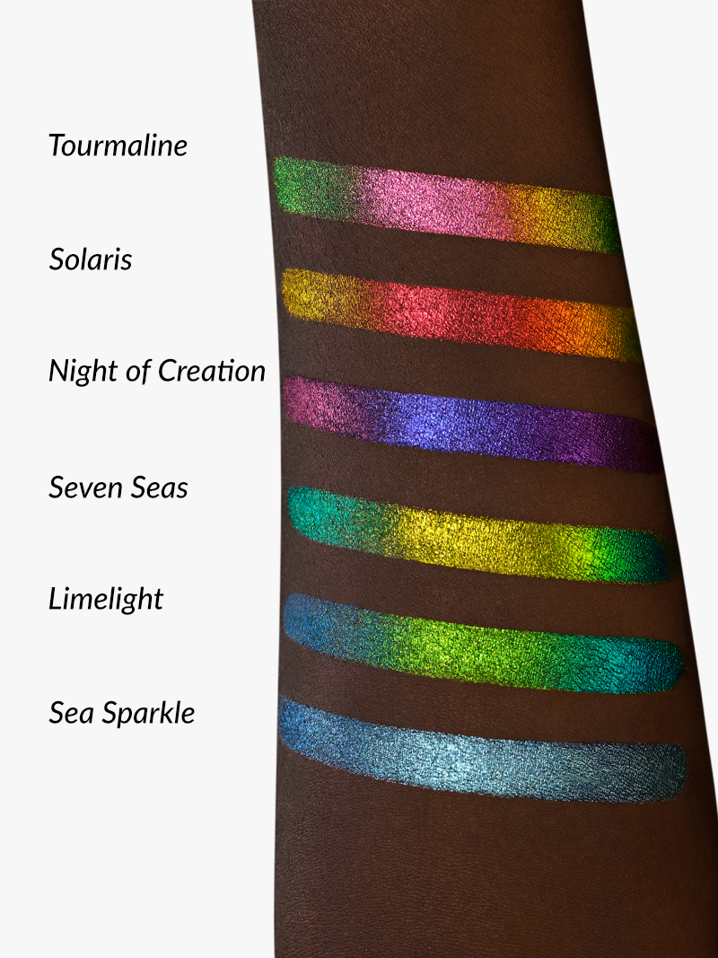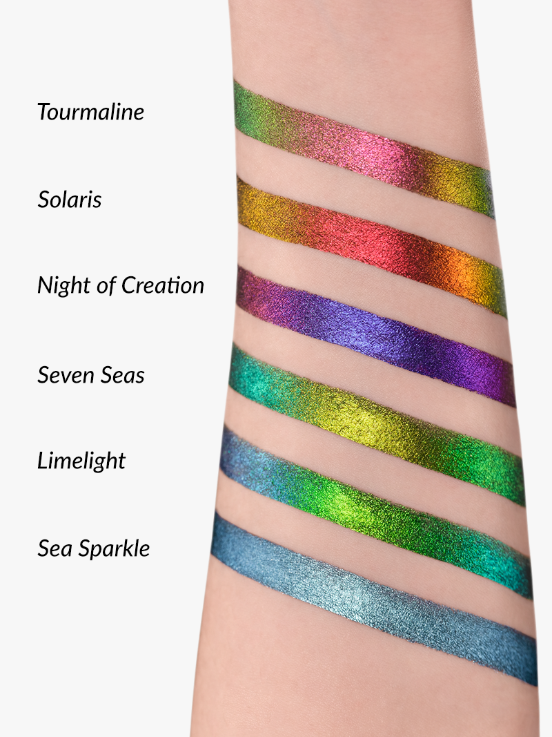 Seven Seas - A prismatic multichrome gel eyeliner with a color shift across Custard - Lime - Grass Green - Turquoise - Lake Blue. This eyeliner boasts a crystalline finish with diamond-like shifts.