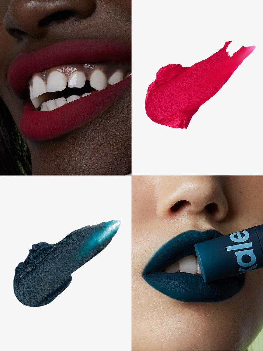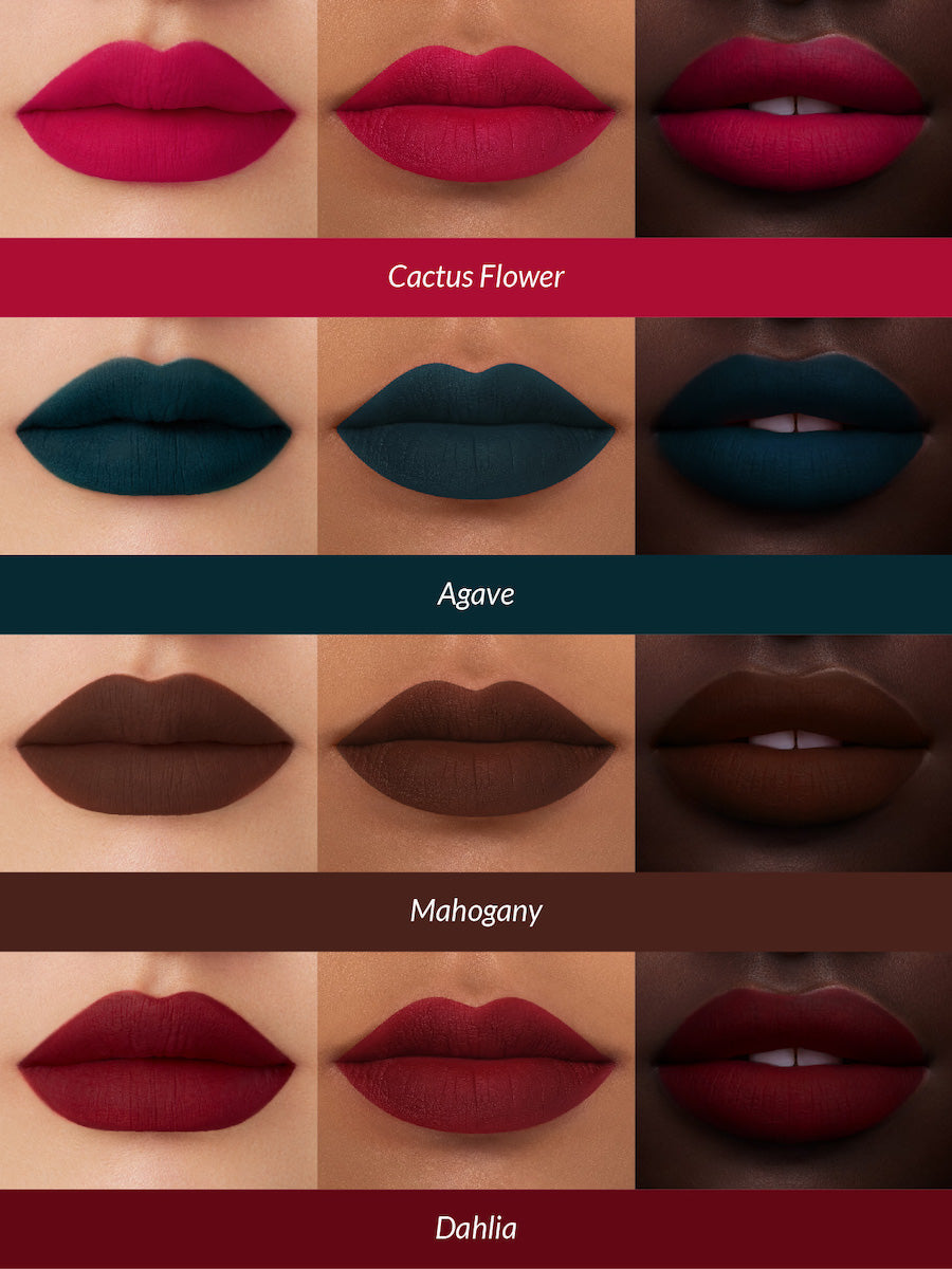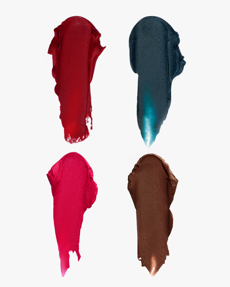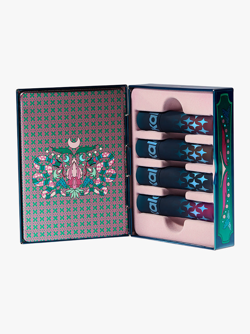 A garden of four grungy lip clays for adding a rich, powerful punch to your look. This vault includes one bright fuchsia, one navy teal, one soft mahogany, and one cool maroon. Sharpen your senses and suit up for adventure with this wild assortment of bold and highly saturated lip clays.