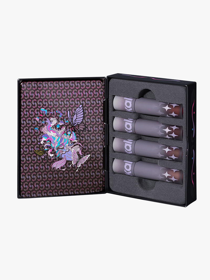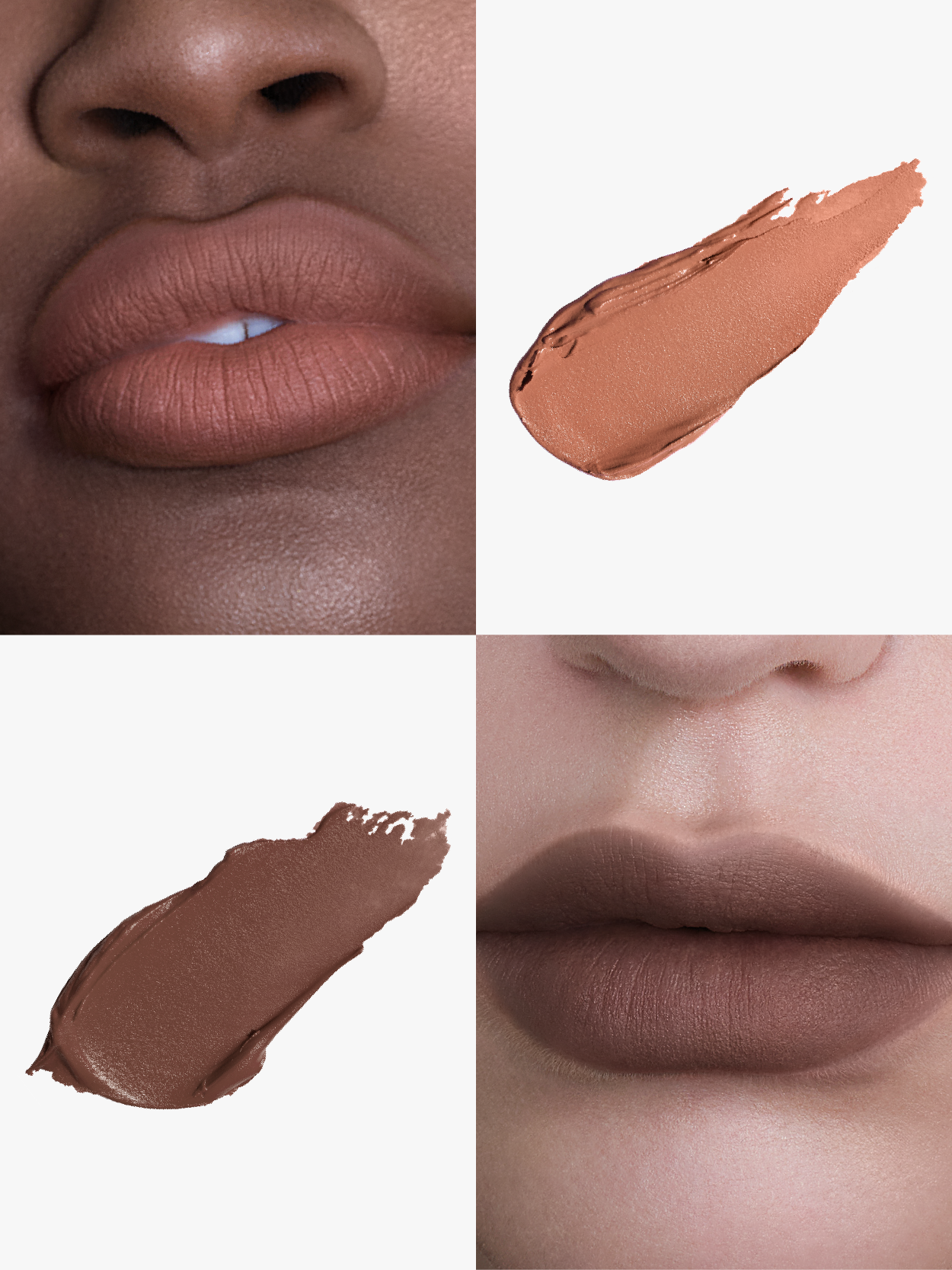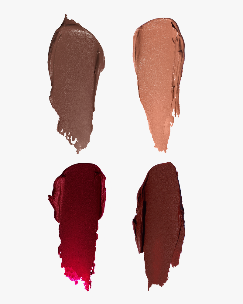 An Arcadia of four supple, in-the-buff lip clays in an ode to timeless beauty. This vault includes a muted neutral beige, a cool-toned taupe brown, an exquisitely rich, warm-toned cocoa brown, and a blackened blue-red that can be smeared out to a magenta. Savor your amorous dalliance and take command of the romancing with this collection of ardent delicacies.