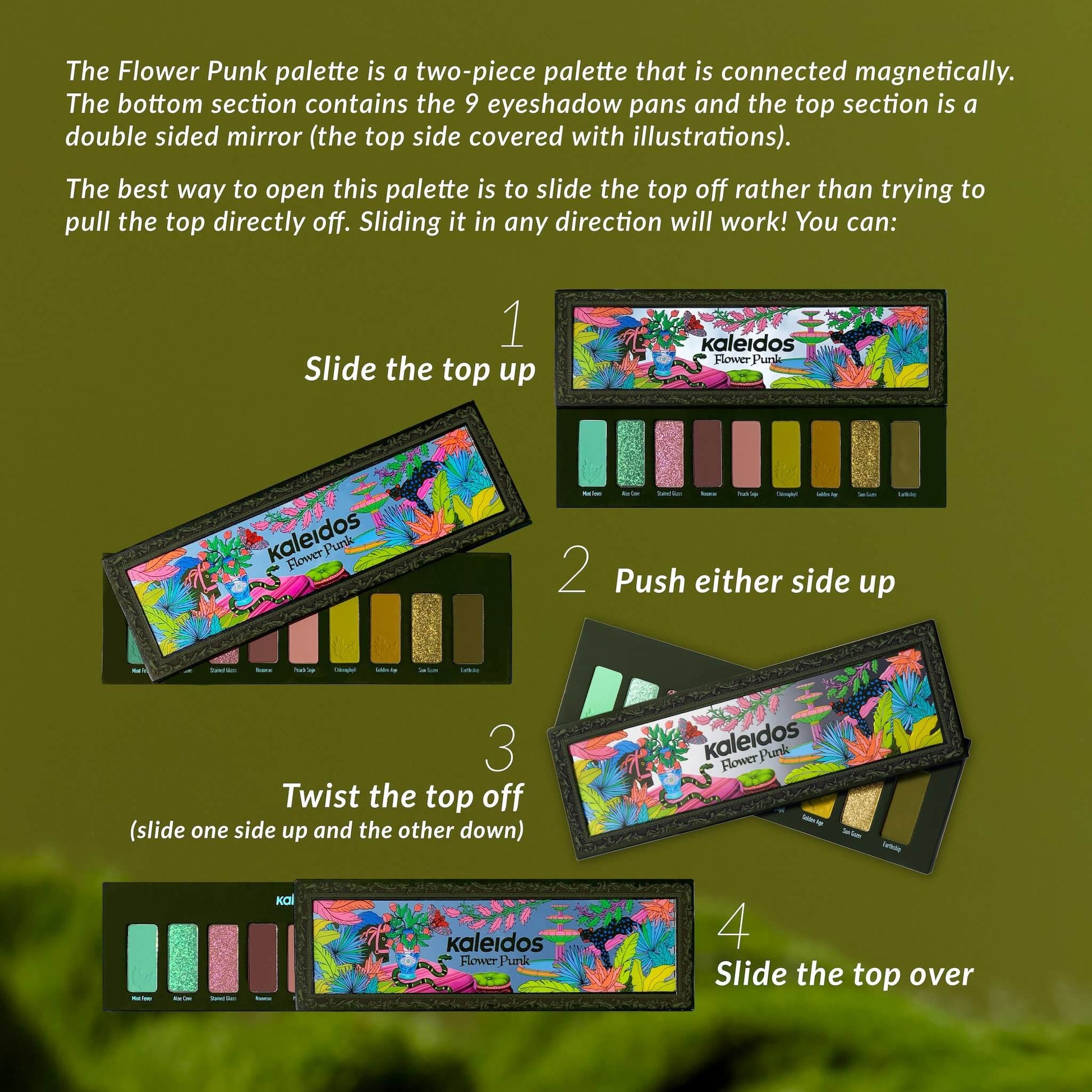 The Flower Punk palette is a two-piece paletteĀ that connects magnetically. The bottom section contains the 9 eyeshadow pans and the top section is a double sided mirror (the top side covered with illustrations).The best way to open this palette is to slide the top off rather than trying to pull the top directly off. Sliding it in any direction will work!