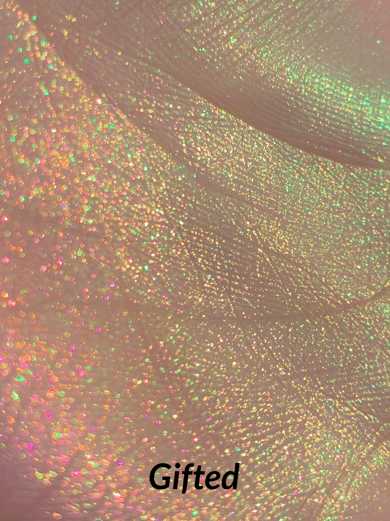 A multichrome fuchsia highlighter with a breathtaking peach and blue-green shift. Blessed with an ethereal glow, this color shifting glaze will illuminate your day and light up the universe.