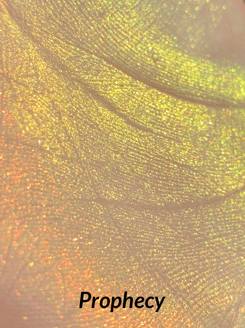 A multichrome champagne highlighter with supernatural green, vermillion, fuchsia, and lime shifts. Destined for ultimate illumination, this color shifting glaze is the chosen one the universe has been waiting for. Fulfill the prophecy and discover a realm of radiance when you make contact with this mystical treasure.